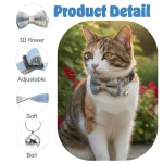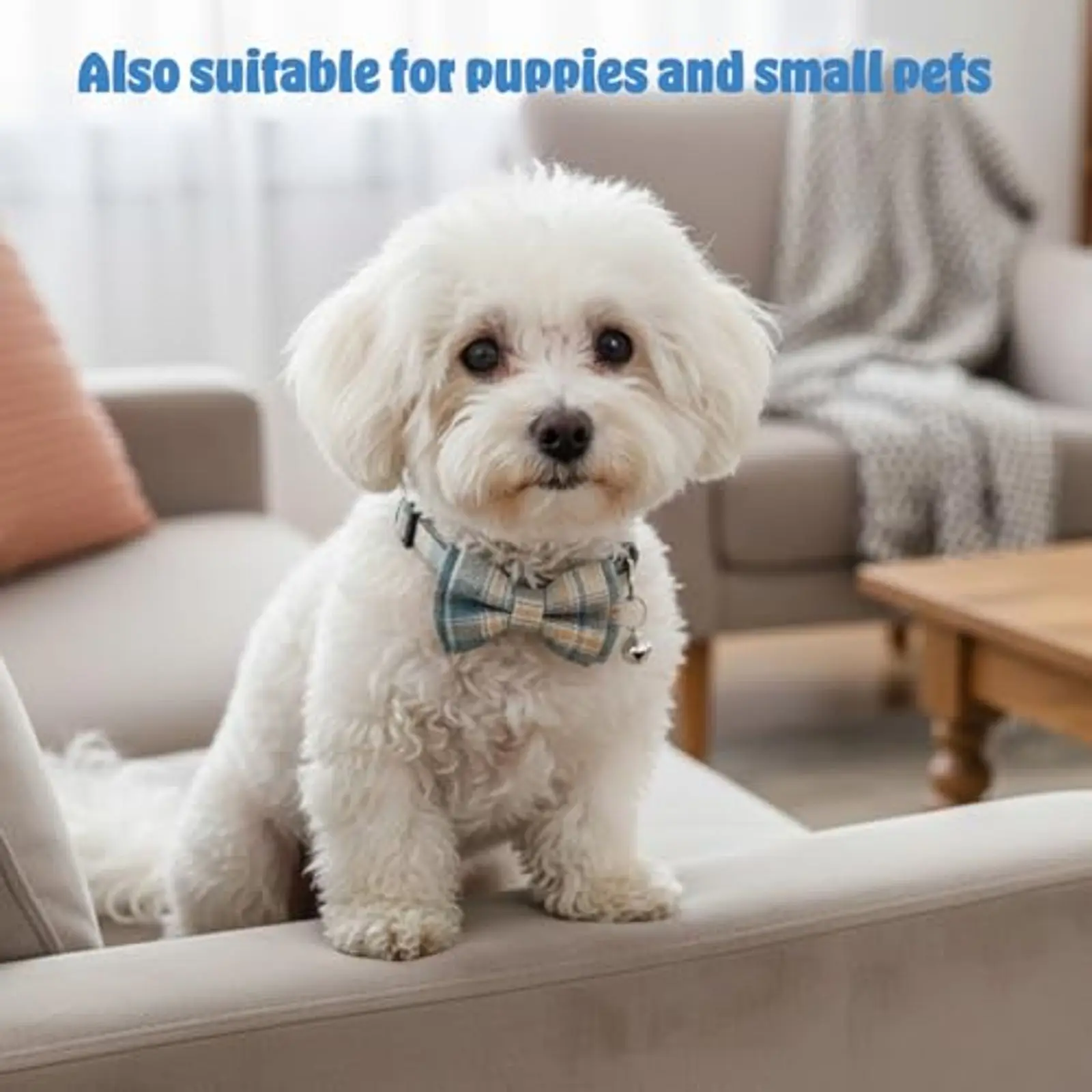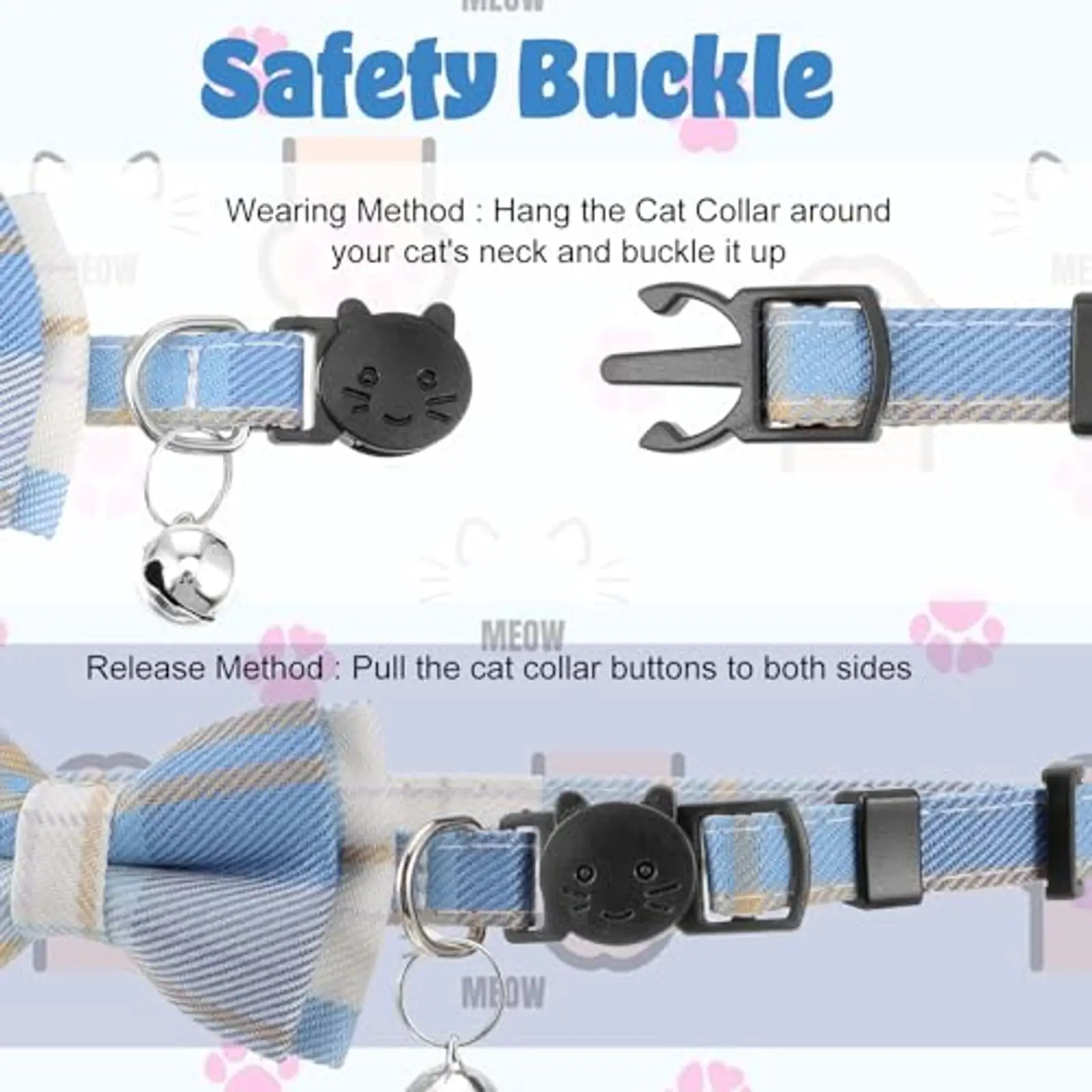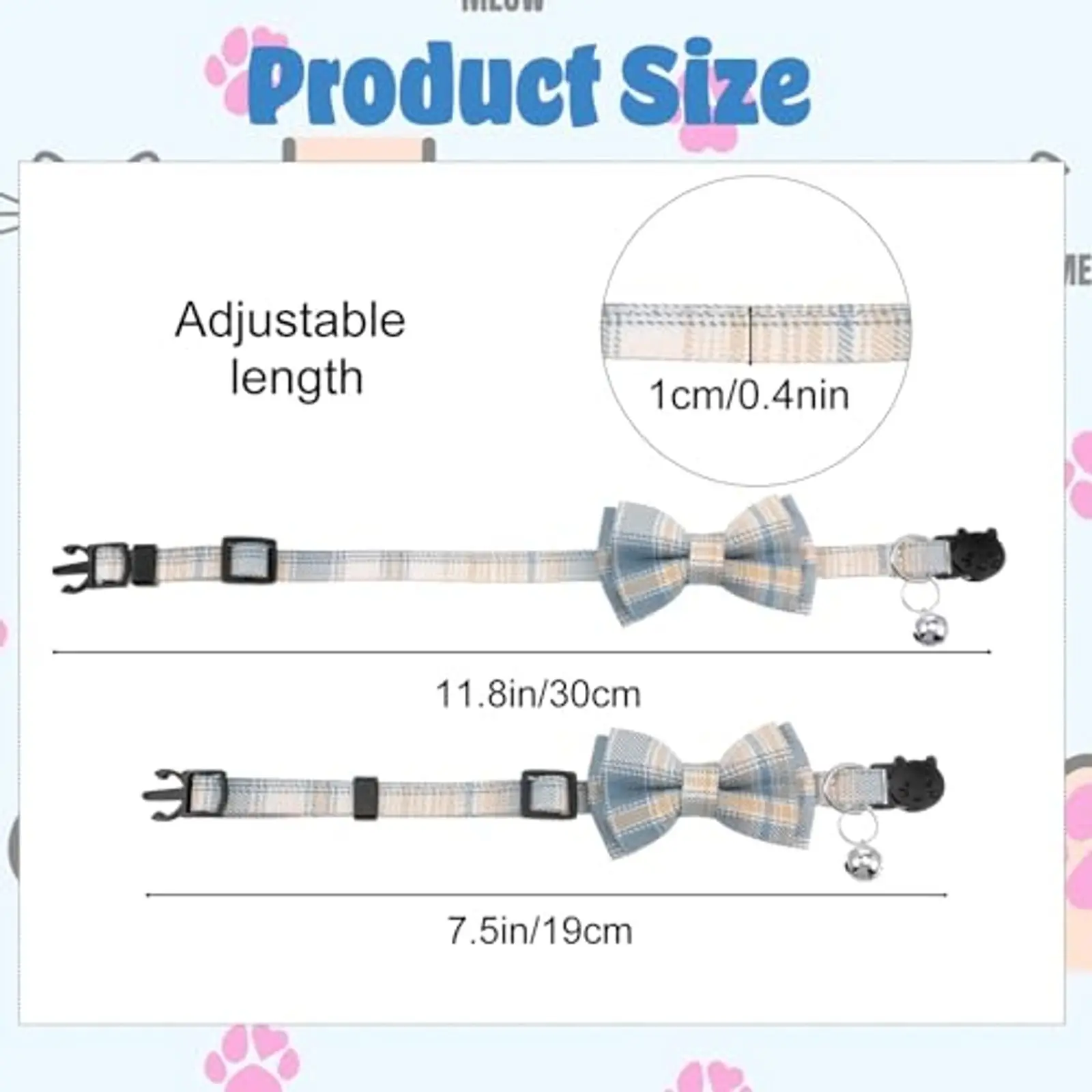 【2-Piece Plaid Cat Collar Set】: This set includes two plaid cat collars with bells (featuring a blue and white color scheme), each adorned with a detachable bow tie accessory. Each collar serves as a charming bow tie accessory for small pets. The adjustable design ensures a perfect fit for kittens, puppies, and smaller adult cats.