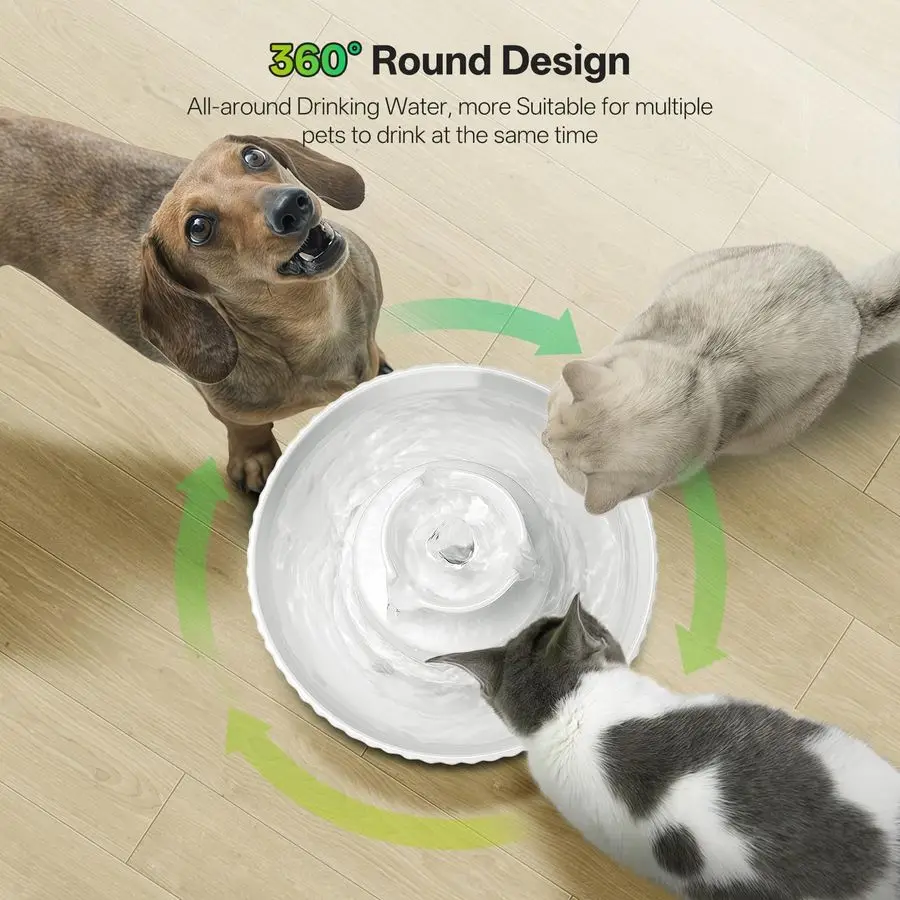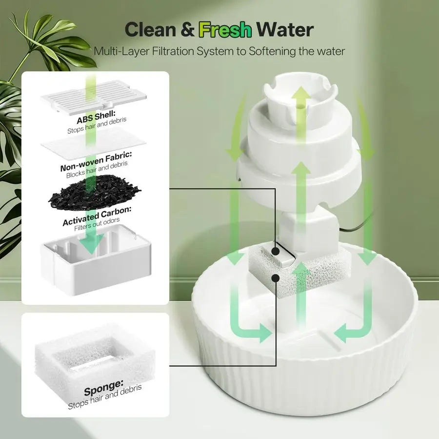MultiFiltration, Water Purification Equipped with activated carbon filter and presponge filter, which can remove sediment, debris and pet hair, this ceramic pet water dispenser can provide a constant supply of flowing purified water. Note It is healthier to change the filter every 4 weeks
